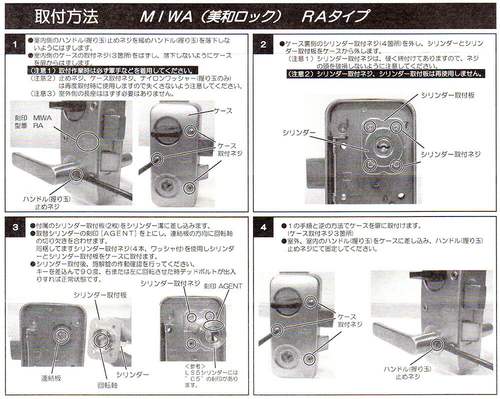 ⇒ RAシリンダー交換説明書はこちら取替用シリンダーの取替手順はこちら (取替手順1) (取替手順2) (取替手順3) (取替手順4) (取替手順5) (取替手順6)