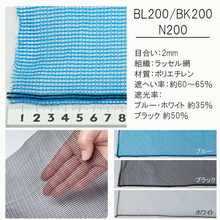 品名 農業用ネット 防風ネット BL200/N200/BK200 納期 約14日後出荷 目合い 2mm目 カラー ブルー【BL200】/ブラック【BK200】 /ホワイト【N200】 材質 ポリエチレン 組織 ラッセル編 遮へい率 約60〜65% 遮光率 ブルー、ホワイト:約35% ブラック:約50% 特徴 豊富な種類とサイズであらゆるニーズに対応 ワイドラッセルはドイツカールマイヤー製の最新型ラッセル機により、ポリエチレン繊維を特殊編み加工した新しい生産資材です。