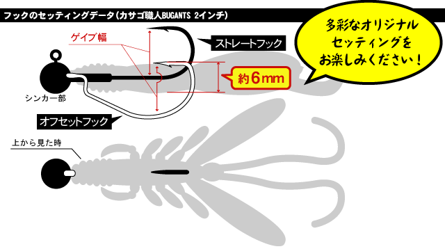 (商品パッケージより) エコギア ワームのサイズ比較についてはこちらを参考にして下さい ≫【ワーム】 エコギア カサゴ職人 バグアンツ 2インチ 111 クリアGlt/レッドスモールブラック+レッドGltバック DATA <全長> 2”インチ(約60mm) <入数> 6本入り <胴体部体高> 約6mm <味・ニオイ> 有り <1本の重さ> 約1.9g 注1)「全長」「重さ」「体高」などの計測値は、実際の商品と若干異なる場合がありますので、あくまで目安としてご利用ください。
