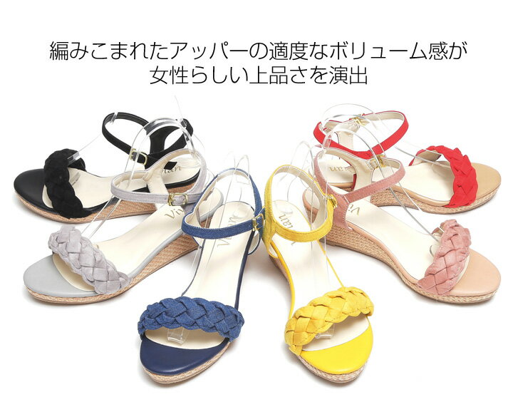 Vivian ビビアン 柔らか 編み込みデザインウェッジサンダル オープントゥ バックベルト サンダル 低反発インソール 歩きやすい ブラック グレー デニム イエロー ピンク レッド レディース 靴